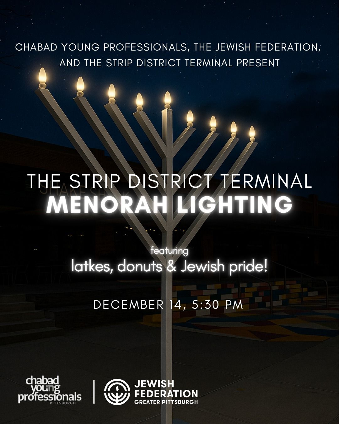 Chabad Young Professionals, the Jewish Federation, and the Strip District Terminal invite you to a festive community menorah lighting filled with warmth, music, and Jewish pride. Enjoy fresh latkes, delicious donuts, and the glow of the menorah as we celebrate the miracle of Chanukah together.